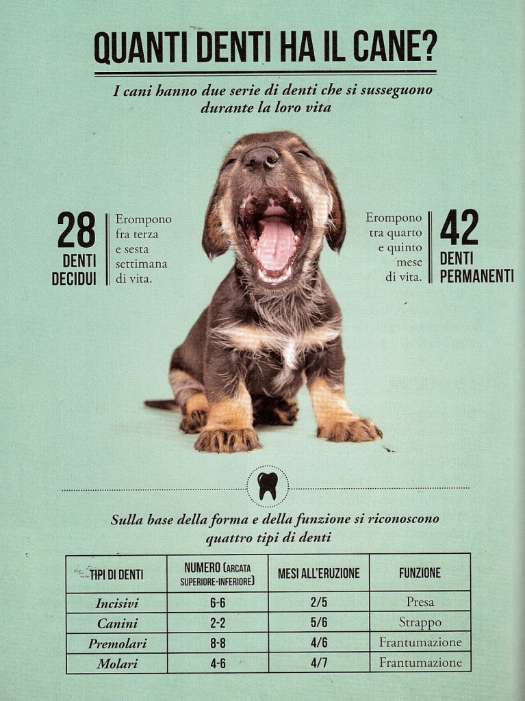 Nella foto che vedete, tratta dall’enciclopedia Il Cane amarlo, capirlo, educarlo a cura dell’Università degli studi di Milano, dipartimento di scienze veterinarie e sanità pubblica potete avere un quadro chiaro dei denti del cane e della loro funzione.